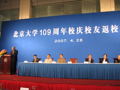 “大学的精神应当体现在它拥有优秀的教授、优秀的学子、优秀的校友,以及他们对社会所做的贡献上”。许智宏校长结合自己在北大求学、后来的工作以及出任北大校长的经历向校友们谈了他对北大精神的理解。许校长引用蔡元培先生“循思想自由原则,取兼容并包主义”、鲁迅先生“北大是常为新的,改进的运动的先锋”、严复先生“夫西学格致…成见必不可居,饰词必不可用,不敢丝毫主张,不得稍行武断,必勤必耐,必公必虚”以及马寅初先生“所谓北大主义者,即牺牲主义也”等北大历史上四位先贤的名言来阐述北大精神。并指出,在当今的国内和国际环境下,北大的学子要打下扎实的基础、培养灵活的应变能力和理解国际环境的能力。
