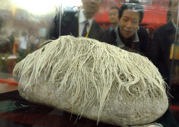 其中最吸引人眼球的莫过于一块名为“一发千钧”的奇石,这块石头上长满了白色长毛,就像老叟的白发。据介绍,石上长出的“白发”是生活在“潮湿”地质带的一种海洋生物,其附于石上经过亿万年的变化,逐渐向上延伸,最终形成密集如丝的直管空心状无脊椎动物化石。一位工作人员现场向好奇的市民演示,只见他点燃一根“白发”的一端,而“白发”的另一端却出现冒烟的奇异现象,令人大呼神奇。