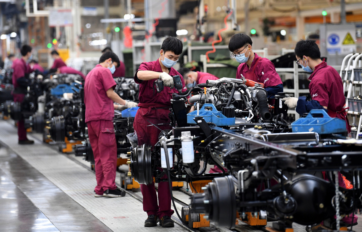 Employees work at the production line of a JAC Motors plant in Hefei, Anhui province, on May 26, 2020. [Photo/Xinhua]
