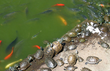 Hundreds of turtles have been released by people into the tiny pond of South Putuo Temple in Xiamen.