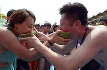 A watermelon-eating competition which was held in a water park in Chongqing has given residents a way to cool off in the hot summer.