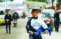 52-year-old Zhang Xumu, exercises by cycling while balancing two stones weighing 34 kg on his head, grabbing people's attention everywhere he goes.